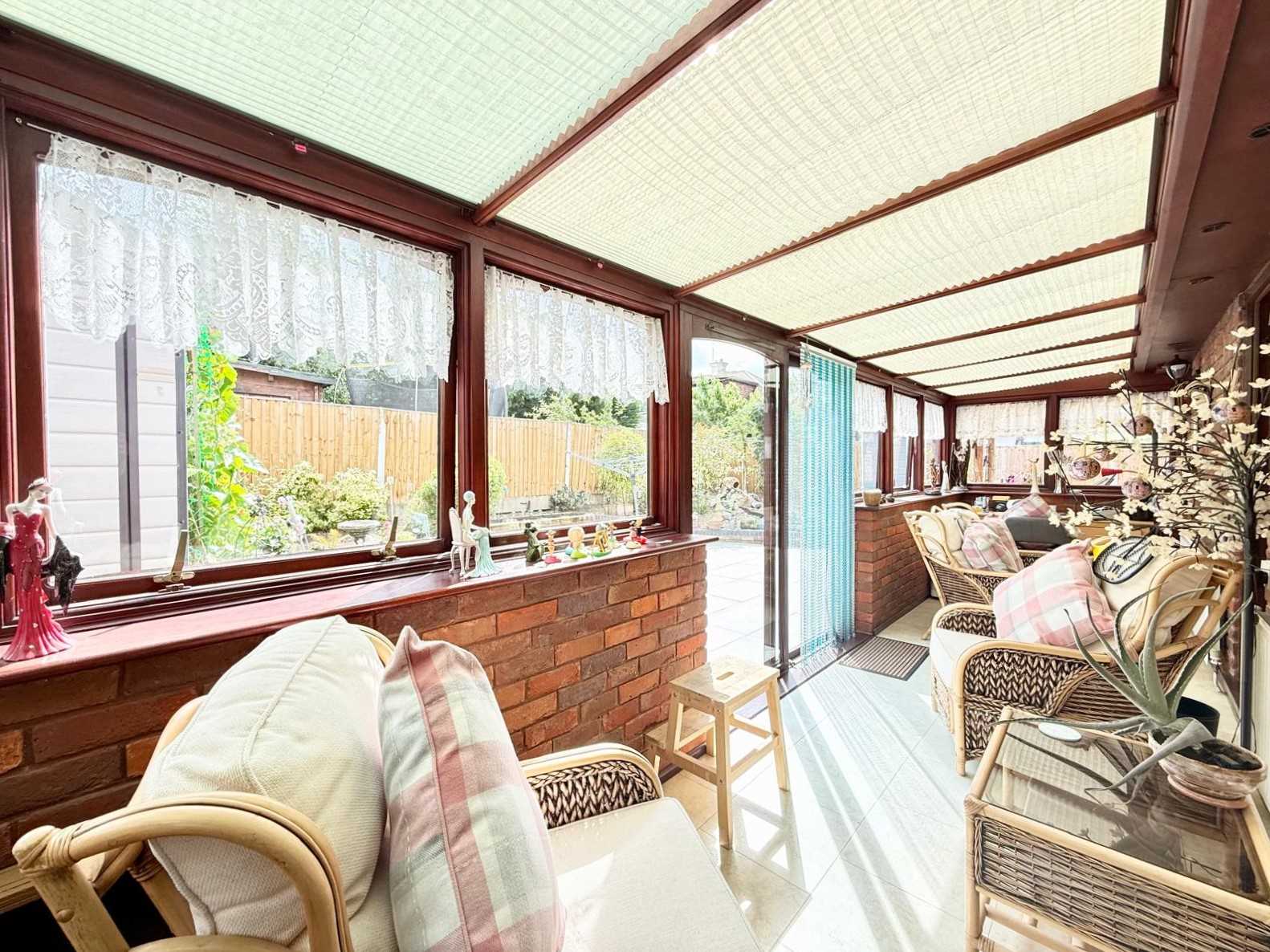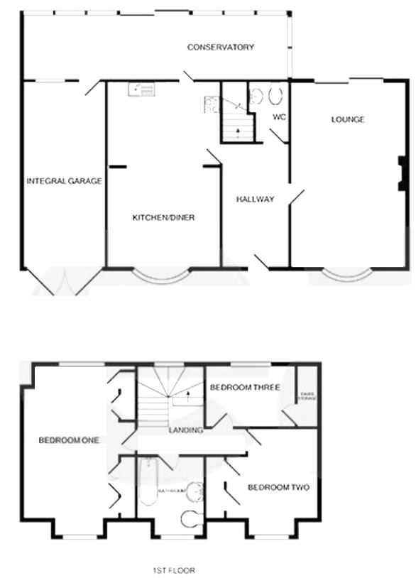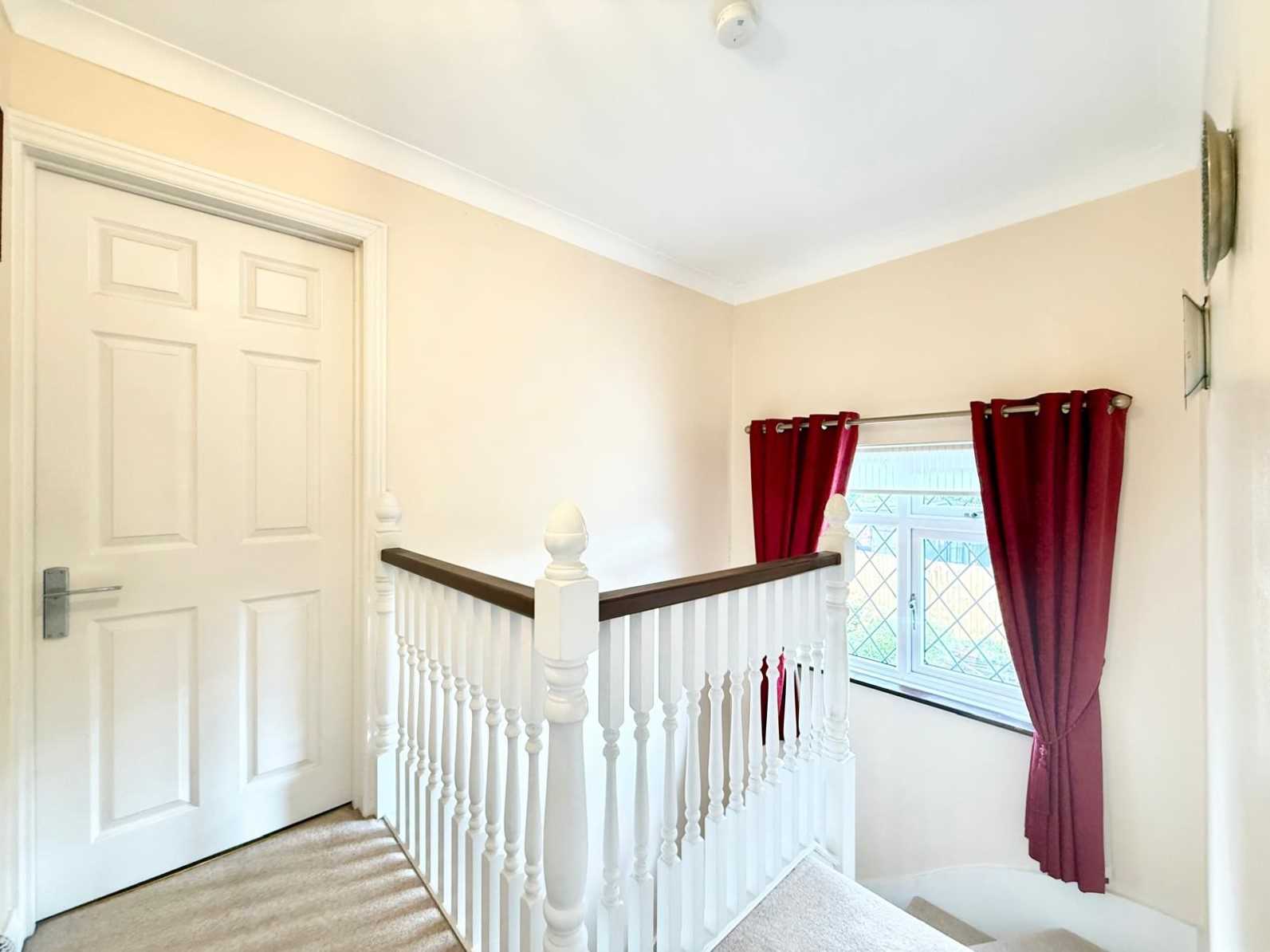 The spacious lounge is situated at the front of the home and features a central gas fireplace, remote-control blinds, and sliding doors that also lead to the garden, creating a lovely indoor-outdoor feel. A handy ground floor WC completes the downstairs layout. Upstairs, the first-floor landing leads to a well-appointed family bathroom and three bedrooms—two generous doubles and a comfortable single. Remote control blinds are fitted to all rooms bar the conservatory, adding both convenience and a contemporary touch.