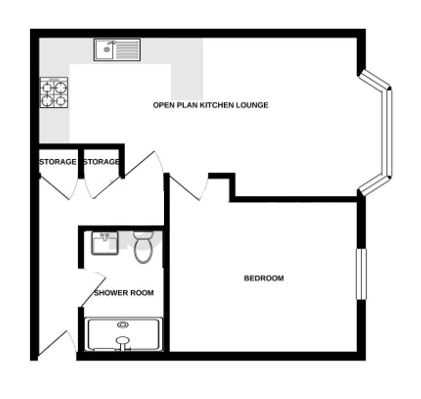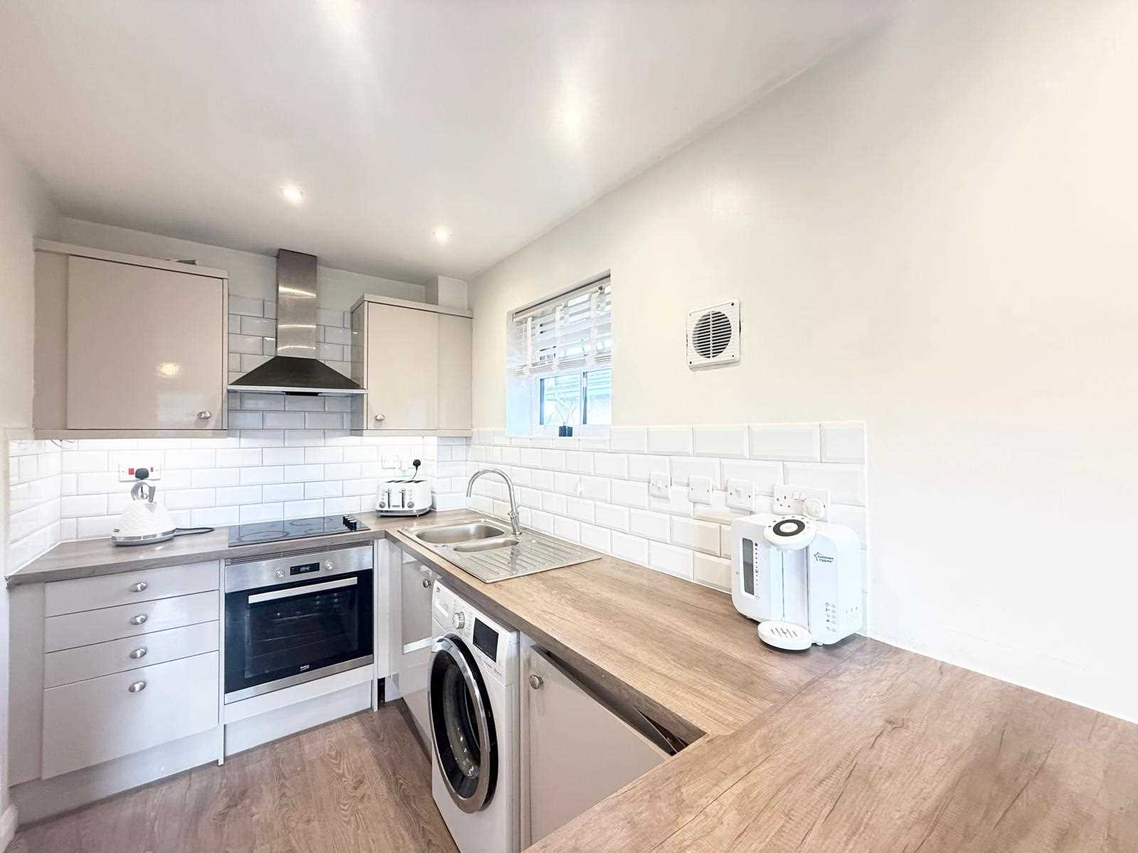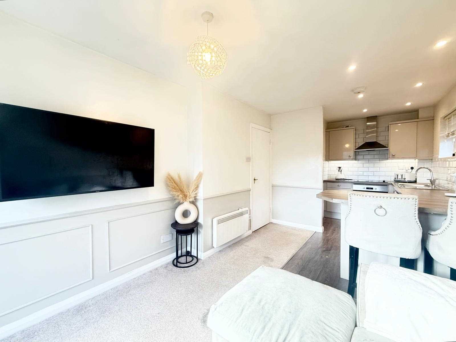 The property is accessed via a secure communal entrance which leads to the apartment’s spacious L-shaped hallway, complete with two useful storage cupboards. Off the hallway is a stylish three-piece shower room featuring a walk-in shower, wash basin, and floor-to-ceiling tiling. The main living space is a bright 22' open-plan kitchen and lounge area, enjoying pleasant views overlooking nearby woodlands. The apartment also benefits from a well-proportioned double bedroom.