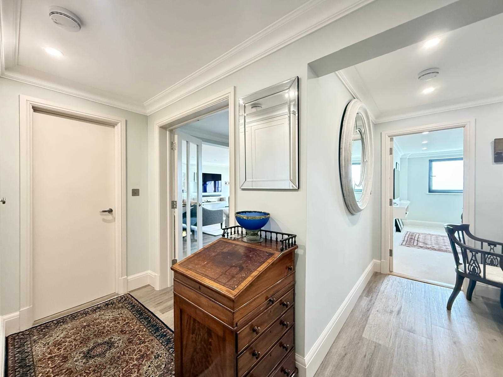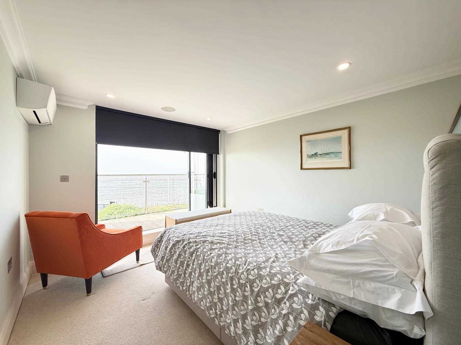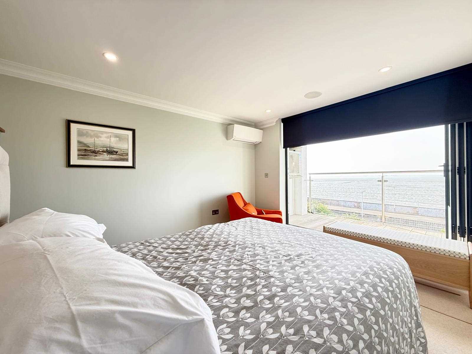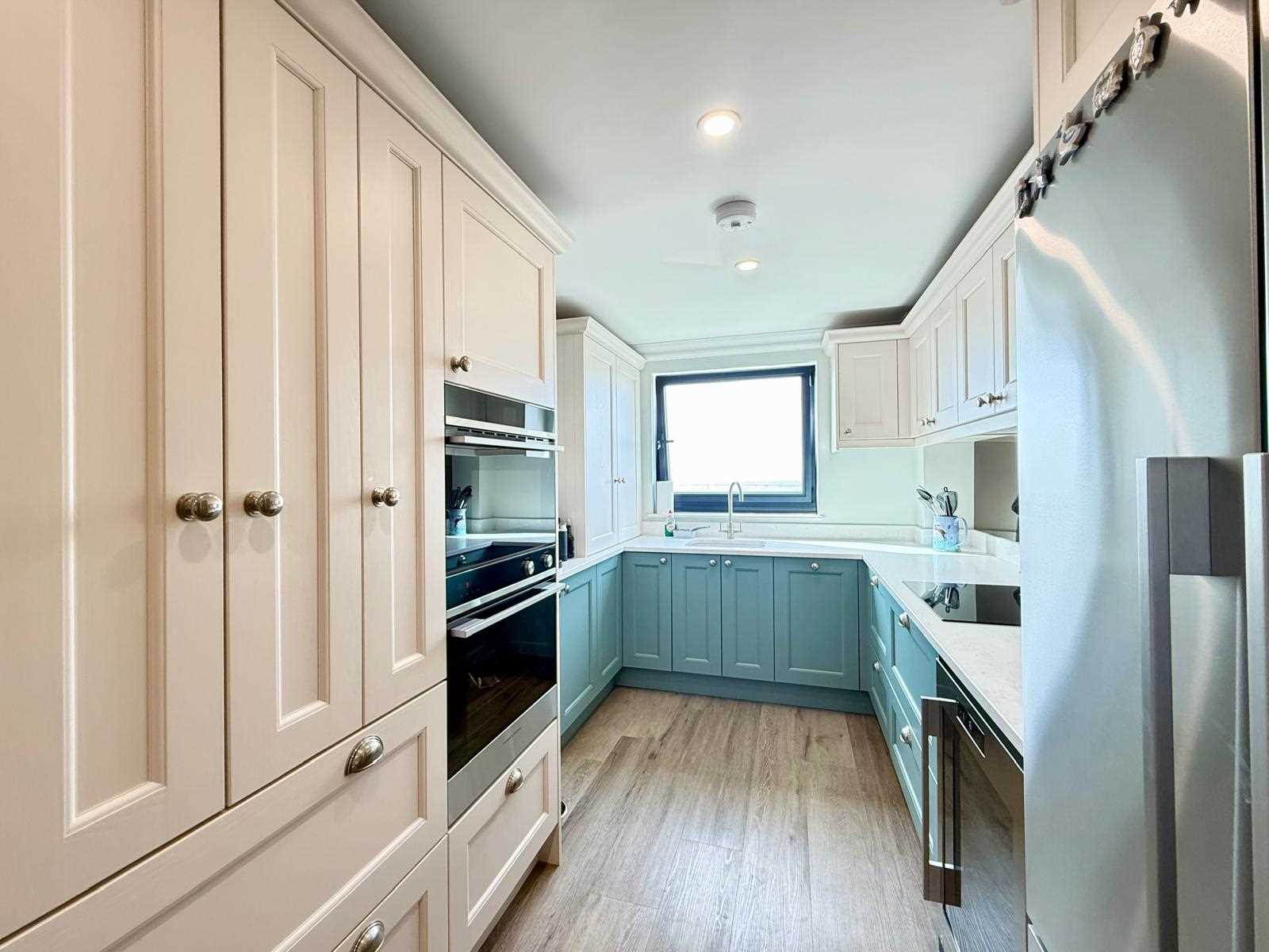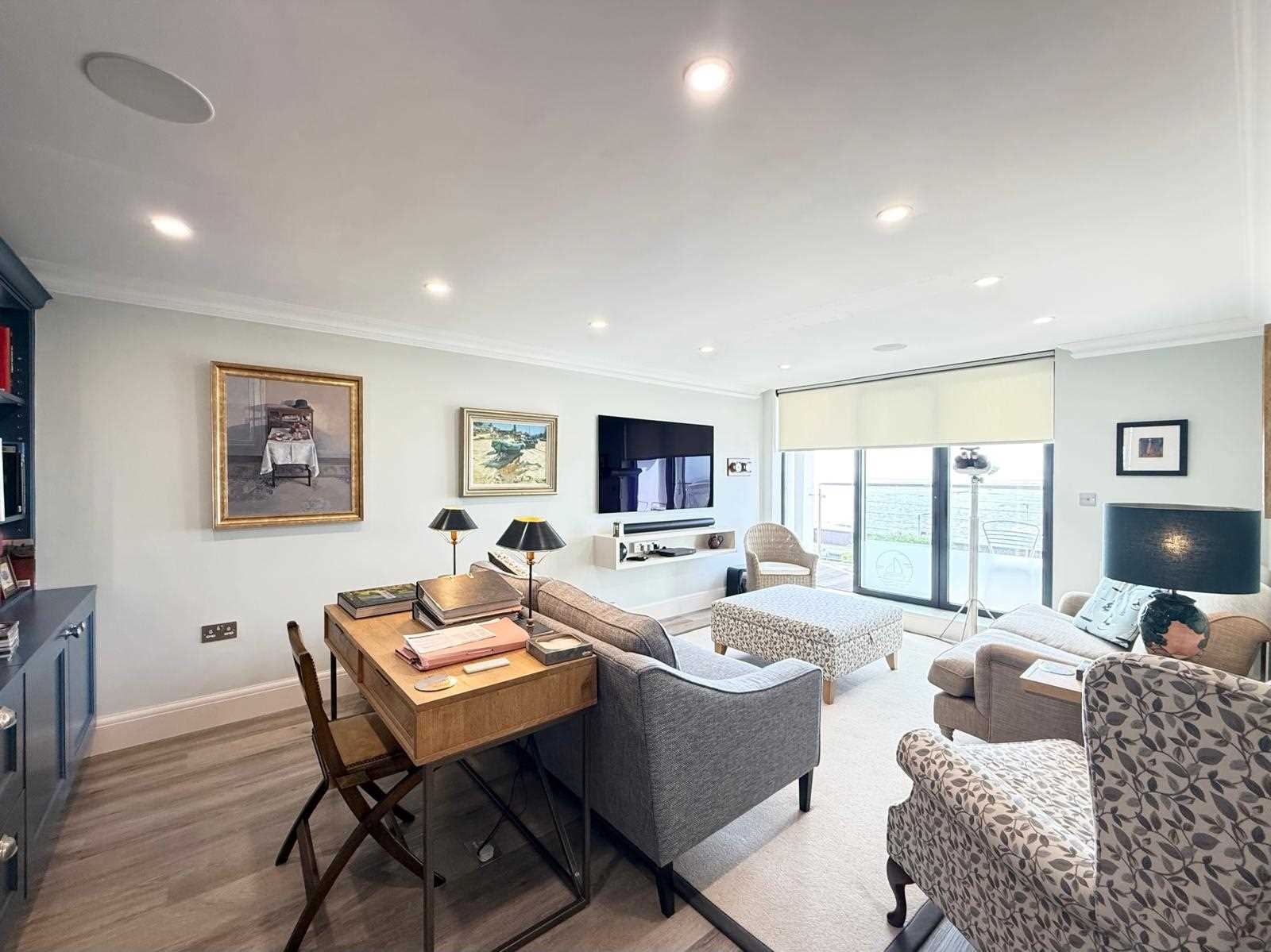 The property features a generous living space with bi-fold doors opening onto a south-facing balcony, perfect for enjoying the coastal outlook. There is a stunning bespoke kitchen/dining area complete with premium fittings and high-spec integrated appliances. The main bedroom benefits from a dressing area, en-suite shower room and access to a second private south-facing balcony. A further double bedroom with fitted wardrobes, contemporary shower room and separate utility room complete the accommodation.